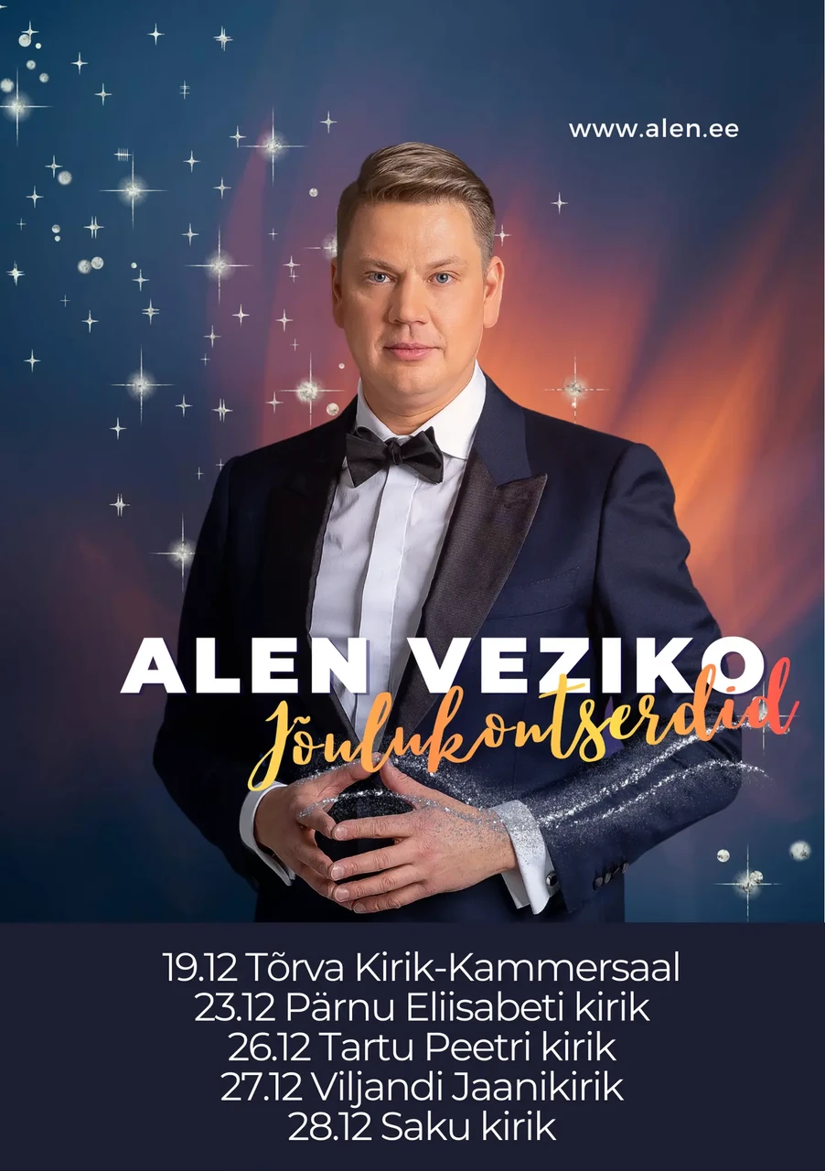 | Alen Veziko jõulukontserdid "NÜÜD TAAS SAJAB LUND" 19.12 - Tõrva Kirk-Kammersaal 23.12 - Pärnu Eliisabeti kirik 26.12 - Tartu Peetri kirik 27.12 - Viljandi Jaani kirik 28.12 - Saku kirik Viis kontserti, viis erinevat koori, dirigenti ja viis erinevat kava. Meeleolukal kontserdil saab kuulata Aleni loomingut ja tuntud jõululaue. OSTA PILET |